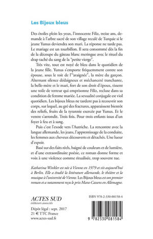 Des étoiles plein les yeux, l'innocente Filiz, treize ans, demande à l'arbre sacré de son village reculé de Turquie si le jeune Yunus deviendra son mari. La réponse ne tarde pas. Le mariage est un tourbillon. Il sera consommé dès la fin de la découpe du gâteau blanc meringue avec le rituel du drap taché du sang de la "petite vierge". Très vite, tout est noyé de bleu dans le quotidien de la jeune fille. Yunus s'emporte fréquemment contre son épouse, sous le toit de l'"araignée", la mère du garçon. Alternant silence dédaigneux et méchanceté tranchante, la belle-mère et le mari, fort de son droit d'époux, tissent une toile de terreur qui emprisonne Filiz, recluse dans sa condition de femme mariée. La sexualité conjugale est viol quotidien. Les bijoux bleus ne tardent pas à recouvrir son corps, sur lequel, au gré des fractures, apparaissent bientôt des reliefs, fruits de la tyrannie exercée par Yunus. Et le ventre s'arrondit. Trois fois. Pour trois enfants issus d'un foyer à feu et à sang. Puis c'est l'exode vers l'Autriche. La rencontre avec la langue allemande, les jeans, l'apprentissage de la conduite, les femmes aux cheveux découverts et détachés. Une lueur d'espoir. Basé sur des faits réels, baigné de couleurs et de lumière, et d'une extraordinaire poésie, ce roman donne forme et voix à une violence comme ritualisée, trop souvent tue.
