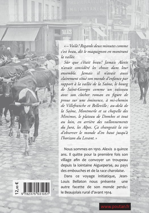 Nous sommes en 1910. Alexis a quinze ans. Il quitte pour la premièe fois son village afin de convoyer un troupeau depuis la lointaine Aigueperse, au pays des embouches et de la race charolaise. Dans ce voyage initiatique, Jean-Louis Bellaton nous présente une autre facette de son monde perdu : le Beaujolais rural d’avant 1914.