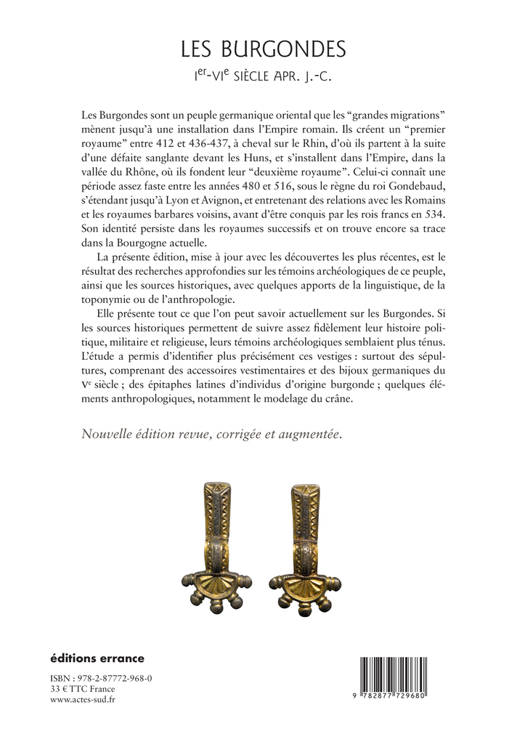 Peuple germanique originaire de l'actuelle Pologne, fixé sur le Rhin puis en Gaule Rhodanienne, les Burgondes ont inscrit leur nom dans la géographie de l'Europe où figure toujours une "Bourgogne" héritière de plusieurs royaumes, et dans ses grandes épopées comme celle des Nibelungen. Ils ont compté parmi les principaux acteurs de la période des Grandes Invasions en Occident. Ce livre fait le point des connaissances actuelles sur ce peuple. Il reconstitue, à partir des sources anicennes, les trois grandes phases de son histoire : une sorte de "préface" qui va des origines à l'installation sur le Rhin (effective au plus tard au début du Ve siècle); le "premier royaume" rhénan, dont la destruction en 436 par les Huns inspira le cycle des Nibelungen et certaines sagas scandinaves ; enfin le "deuxième royaume" rhodanien, qui marqua l'apogée des Burgondes avant d'être intégré au royaume des Francs en 534. Pour chacune de ces périodes sont présentés les vestiges archéologiques qui sont les traces matérielles du peuple burgonde, particulièrement dans le deuxième royaume. Une place a également été faite aux éléments linguistiques et toponymiques. Cette étude permet de dégager un portrait aussi fidèle que possible de ce peuple burgonde devenu, au terme de ses aventures, un élément constitutif des populations française et suisse. Mais elle met aussi en lumière l'importance de leur interaction avec d'autres grands acteurs de la fin de l'Antiquité : les Huns, destructeurs du premier royaume, les Goths, les Alamans, les Alains, et le monde romain tardif que le second royaume prolongea autant qu'il le remplaça. La culture composite de la Burgondie des Ve-VIe siècles, marquée par ces diverses influences, est le reflet d'une période de brassage et de façonnage d'identités nouvelles.