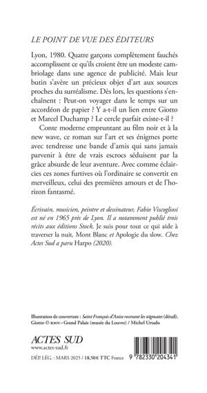 Lyon, 1980. Quatre garçons complètement fauchés accomplissent ce qu'ils croient être un modeste cambriolage dans une agence de publicité. Mais leur butin s'avère un précieux objet d'art aux sources proches du surréalisme. Dès lors, les questions s'enchaînent : Peut-on voyager dans le temps sur un accordéon de papier ? Y a-t-il un lien entre Giotto et Marcel Duchamp ? Le cercle parfait existe-t-il ? Conte moderne empruntant au film noir et à la new wave, ce roman sur l'art et ses énigmes porte avec tendresse une bande d'amis qui sans jamais parvenir à être de vrais escrocs séduisent par la grâce absurde de leur aventure. Avec comme éclaircies ces zones furtives où l'ordinaire se convertit en merveilleux, celui des premières amours et de l'horizon fantasmé.