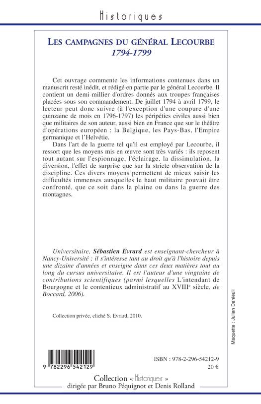 Cet ouvrage commente un manuscrit inédit, rédigé en partie par le général Lecourbe, et contenant les ordres donnés aux troupes françaises sous son commandement de juillet 1794 à avril 1799, en France et en Europe. Les moyens militaires mis en œuvre reposait tant sur l'espionnage, l'éclairage, la dissimulation, la diversion que sur la stricte observation de la discipline. Ce témoignage permet de mieux saisir les difficultés auxquelles le haut militaire pouvait être confronté.