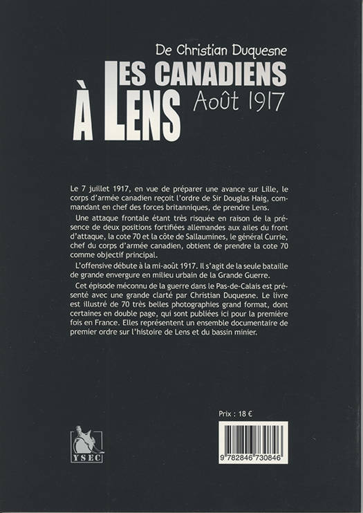 Le 7 juillet 1917, en vue de préparer une avance sur Lille, le corps d’armée canadien reçoit l’ordre de Sir Douglas Haig, commandant en chef des forces britanniques, de prendre Lens. Une attaque frontale étant très risquée en raison de la présence de deux positions fortifiées allemandes aux ailes du front d’attaque, la cote 70 et la côte de Sallaumines, le général Currie, chef du corps d’armée canadien, obtient de prendre la cote 70 comme objectif principal. L’offensive débute à la mi-août 1917. Il s’agit de la seule bataille de grande envergure en milieu urbain de la Grande Guerre. Cet épisode méconnu de la guerre dans le Pas-de-Calais est présenté avec une grande clarté par Christian Duquesne. Le livre est illustré de 70 très belles photographies grand format, dont certaines en double page, qui sont publiées ici pour la première fois en France. Elles représentent un ensemble documentaire de premier ordre sur l’histoire de Lens et du bassin minier.