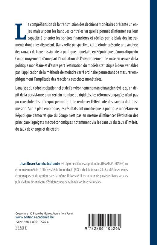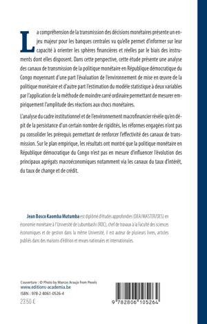 Les canaux de transmission de la politique monétaire en République démocratique du Congo jouent un rôle très prépondérant dans la régulation du cadre macroéconomique de l'économie RD congolaise. Les autres nations peuvent s'en servir pour comprendre les particularités congolaises et afin d'apporter solution aux problèmes similaires qu'elles enregistrent.