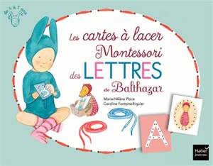 Vous trouverez dans ce coffret : 26 cartes à lacer des lettres majuscules, bleues pour les consonnes, roses pour les voyelles, 2 cartes à lacer de Balthazar et de Pépin, des lacets, et un mode d’emploi.
