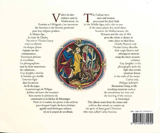 Visiter les sites cathares entre la Méditerranée, les Pyrénées et l’Albigeois, c’est rencontrer des hommes et des femmes persécutés pour leur religion pendant de Moyen-Age. Le texte de Charles Peytavie et Nicolas Gouzy trace un chemin où chaque phase s’appuie sur des connaissances historiques précises et actualisées. En photographiant tous les lieux importants du Catharisme, Guy Jungblut cherche la lumière qui réveille l’émotion figée dans les pierres. Au fil des pages, les personnages de Philippe Jarbinet restituent des moments forts comme la cérémonie du consolament ou le bûcher de Montségur. A partir de la matière des pierres et des archives pour évoquer l’esprit de bons chrétiens appelés aussi hérétiques cathares, tel est le propos de cet album.