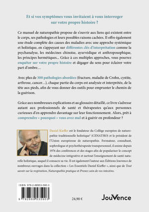 Et si vos symptômes vous invitaient à vous interroger sur votre propre histoire ? Ce manuel de naturopathie propose de s’ouvrir aux liens qui existent entre le corps, ses pathologies et leurs possibles raisons cachées. Il offre également une étude complète des causes des maladies avec une approche systémique et holistique, en s’appuyant sur différentes clés d’interprétation comme la psychanalyse, les médecines chinoise, ayurvédique et anthroposophique, les principes hermétiques... Grâce à ces multiples approches, vous pourrez enquêter sur votre propre histoire et dégager du sens pour éclairer votre part d’ombre… Avec plus de 300 pathologies abordées (fracture, maladie de Crohn, cystite, arthrose, cancer…), chaque partie du corps est analysée et interprétée, de la tête aux pieds, afin de vous donner des outils pour emprunter le chemin de la guérison. Grâce aux nombreuses explications et au glossaire détaillé, ce livre s’adresse autant aux professionnels de santé et thérapeutes qu’aux personnes curieuses d’en apprendre davantage sur leur fonctionnement. Alors, prêt à comprendre « pourquoi » vous avez mal et à guérir en profondeur ?