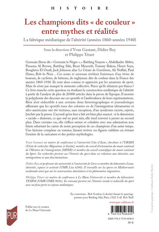 Germain Ibron dit « Germain le Nègre », « Battling Youyou », Abdelkader Abbès, Panama Al Brown, Battling Siki, René Menrath, Tommy Bakou, Henri Soya, Boughéra El Ouafi, Jack Johnson alias Le Géant de Gavelston, Ali Neffati, Paul Hams, Bob-le-Noir... Ces noms et surnoms révèlent l’existence d’un vivier de boxeurs, de cyclistes, de lutteurs, de rugbymen dits de couleur dans la France des années 1860-1930. Ils sont alors connus et appréciés par les amateurs de sport. Mais ils n’ont pas marqué la mémoire collective. Parce qu’ils n’étaient pas blancs ? Ce livre tranche cette question en étudiant la construction médiatique de l’altérité à partir de l’analyse de plus de 20 000 articles dans la presse de l’époque. Il montre la polyphonie des discours sur ces sportifs et l’ambivalence de leurs représentations. Rien n’est réductible à une certaine doxa historiographique et journalistique affirmant que les sportifs issus des colonies ou de l’immigration ultramarine et afro-américaine ont été victimes, sans exception, d’un syndrome raciste, rejetés, lynchés par la presse. L’accueil qu’on leur a fait est bien plus nuancé : si la dimension « raciale » demeure, ce que nul ne peut nier, elle tend souvent à passer au second plan. Dans certains cas, elle s’efface même et cohabite avec une admiration non feinte rebattant les cartes de notre perception de ces champions d’un autre temps. Une histoire complexe en somme, faisant revivre ces figures oubliées en évitant l’ornière de la caricature et des petites mythologies.