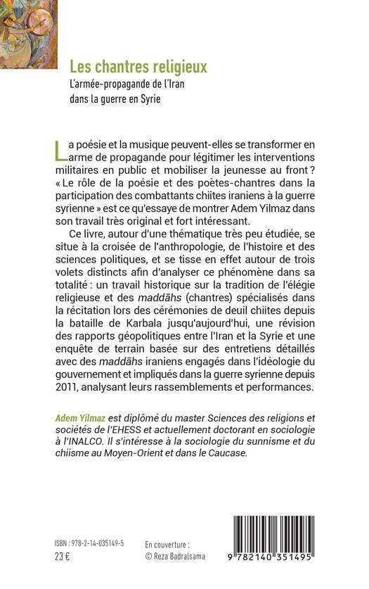 La poésie et la musique peuvent-elles se transformer en arme de propagande pour légitimer les interventions militaires en public et mobiliser la jeunesse au front ? Ce livre, autour d'une thématique très peu étudiée, se situe à la croisée de l'anthropologie, de l'histoire et des sciences politiques. il s'articule autour de trois volets distincts afin d'analyser ce phénomène dans sa totalité un travail historique sur la tradition de l'élégie religieuse et des maddhs (chantres) spécialisés dans la récitation lors des cérémonies de deuil chiites depuis la bataille de Karbala jusqu'aujourd'hui, une révision des rapports géopolitiques entre l'Iran et la Syrie et une enquête de terrain basée sur des entretiens détaillés avec des maddhs iraniens engagés dans l'idéologie du gouvernement et impliqués dans la guerre syrienne depuis 2011.