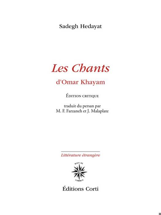 Il y a peu d’œuvres qui soient, autant que les quatrains d’Omar Khayam, admirées, rejetées, haïes, falsifiées, calomniées, condamnées, disséquées, et qui atteignent une renommée universelle, en restant pourtant méconnues. Sadegh Hedayat s’est découvert très jeune des affinités avec cette œuvre et s’est proposé de faire découvrir à ses contemporains “l’homme et sa pensée à travers une poignée de quatrains en langue persane attribués à Khayam mathématicien et astronome des V et VI siècles de l’Hégire (vers 1050-1123 ap. J.-C.)”. De plus, il s’est fait le lecteur critique des auteurs qui avaient entrepris, avant lui, d’analyser les quatrains, des éditeurs qui les avaient fait lire : pour Hedayat, la plupart se sont fourvoyés, les premiers en lui attribuant des réflexions ou des idées contradictoires révélant par là leur totale méconnaissance de l’œuvre – les seconds en éditant, sous son nom, des quatrains dont il ne pouvait être l’auteur. C’est cette édition critique des Chants de Khayam, à laquelle il travailla en 1923, âgé de vingt ans, que nous rééditons aujourd’hui.