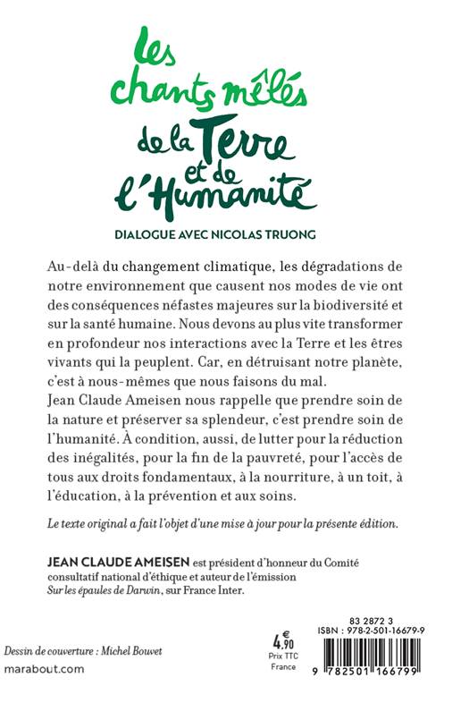 Au-delà du changement climatique, les dégradations de notre environnement que causent nos modes de vie ont des conséquences néfastes majeures sur la biodiversité et sur la santé humaine. Nous devons au plus vite transformer en profondeur nos interactions avec la Terre et les êtres vivants qui la peuplent. Car, en détruisant notre planète, c’est à nous-mêmes que nous faisons du mal. Jean Claude Ameisen nous rappelle que prendre soin de la nature et préserver sa splendeur, c’est prendre soin de l’humanité. À condition, aussi, de lutter pour la réduction des inégalités, pour la fin de la pauvreté, pour l’accès de tous aux droits fondamentaux, à la nourriture, à un toit, à l’éducation, à la prévention et aux soins.