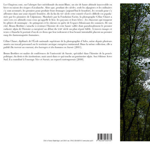 Les Chapieux sont, sur l'abrupte face méridionale du mont Blanc, un site de haute altitude inaccessible en hiver en raison des dangers d'avalanche. Alors que, pendant des siècles, seuls les alpagistes et les militaires s'y sont aventurés, les premiers pour produire leurs fromages (aujourd'hui le beaufort), les seconds pour s'y affronter dans une zone réputée frontière, dès la fin du dix-neuvième siècle cette contrée d'accès difficile est popularisée par les pionniers de l'alpinisme. Mandatée par la Fondation Facim, la photographe Céline Clanet a suivi vers ces altitudes tous ceux qu'appelle le lieu : les paysans et leurs bêtes ; les chasseurs qui traquent les gibiers de montagne ; les grimpeurs et les skieurs en quête de l'espace éblouissant des sommets. De son côté, Bruno Berthier s'attache à restituer l'histoire de cette haute vallée dont paradoxalement le premier cadastre alpin de l'histoire a enregistré au début du dix-huitième siècle un plan réputé fidèle. À travers images et textes s'ébauche le portrait d'un de ces lieux que leur isolement et leur beauté intraitable placent au premier rang des fantasmagories humaines.