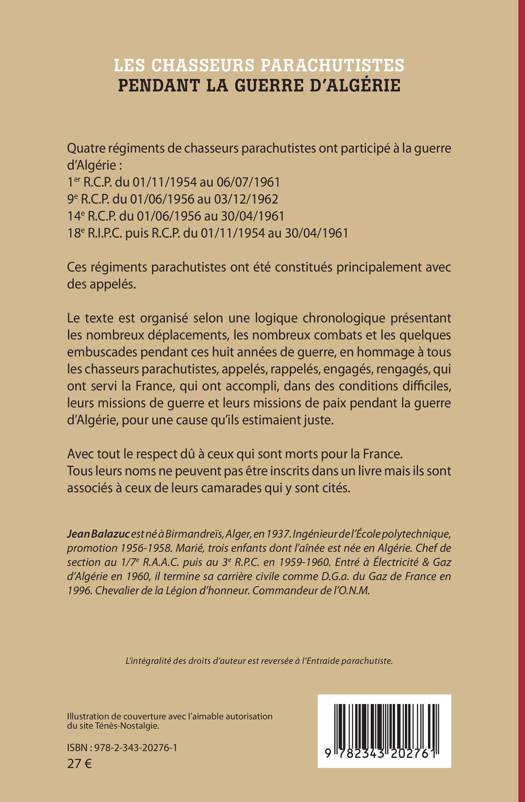 Quatre régiments de chasseurs parachutistes, constitués principalement d'appelés, ont participé à la guerre d'Algérie. Le texte est organisé selon une logique chronologique présentant les nombreux déplacements, les nombreux combats et les quelques embuscades pendant ces huit années de guerre, en hommage à tous les chasseurs parachutistes, appelés, rappelés, engagés, rengagés, qui ont servi leur pays, qui ont accompli, dans des conditions difficiles, leurs missions de guerre et leurs missions de paix pendant la guerre d'Algérie, pour une cause qu'ils estimaient juste.