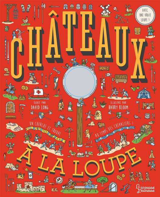 Un cherche-et-trouve géant, avec une vraie loupe (grossit trois fois) pour ne rater aucun détail. Sur chaque double-page, il faut utiliser la loupe, incluse dans la couverture, pour retrouver 10 éléments cachés dans l’image. Les solutions se trouvent à la fin de l’ouvrage. Un livre-jeu très documenté : tout ce que vous avez toujours voulu savoir sur les châteaux, la vie quotidienne au temps des chevaliers, les grandes batailles du Moyen âge, les croisades... se trouve dans ce livre.