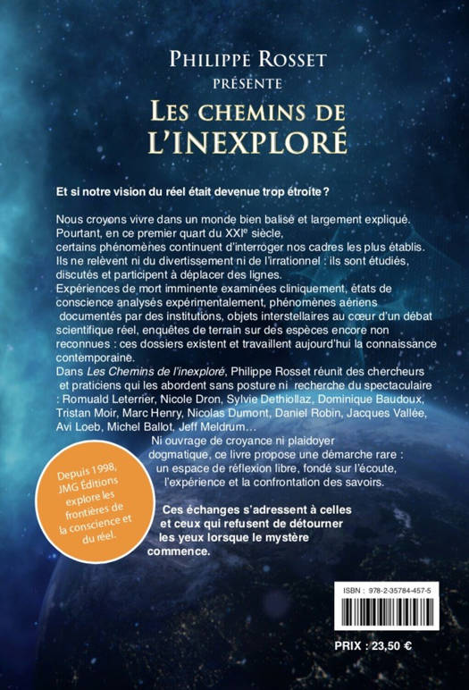 Et si notre vision du réel était devenue trop étroite ? Nous croyons vivre dans un monde bien balisé et largement expliqué. Pourtant, en ce premier quart du XXI? siècle, certains phénomènes continuent d’interroger nos cadres les plus établis. Ils ne relèvent ni du divertissement ni de l’irrationnel : ils sont étudiés, discutés et participent à déplacer des lignes. Expériences de mort imminente examinées cliniquement, états de conscience analysés expérimentalement, phénomènes aériens documentés par des institutions, objets interstellaires au cœur d’un débat scientifique réel, enquêtes de terrain sur des espèces encore non reconnues : ces dossiers existent et travaillent aujourd’hui la connaissance contemporaine. Dans Les Chemins de l’inexploré, Philippe Rosset réunit des chercheurs et praticiens qui les abordent sans posture ni recherche du spectaculaire : Romuald Leterrier, Nicole Dron, Sylvie Dethiollaz, Dominique Baudoux, Tristan Moir, Marc Henry, Nicolas Dumont, Daniel Robin, Jacques Vallée, Avi Loeb, Michel Ballot, Jeff Meldrum… Ni ouvrage de croyance ni plaidoyer dogmatique, ce livre propose une démarche rare : un espace de réflexion libre, fondé sur l’écoute, l’expérience et la confrontation des savoirs. Ces échanges s’adressent à celles et ceux qui refusent de détourner les yeux lorsque le mystère commence. Cet ouvrage réunit : Dominique Baudoux, pharmacien aromatologue, spécialiste international des huiles essentielles et fondateur du Collège International d’Aromathérapie. Michel Ballot, explorateur français, chercheur de terrain en cryptozoologie, spécialiste du Mokélé-Mbembé en Afrique centrale. Sylvie Dethiollaz, docteure en biologie moléculaire, directrice de l’Institut Suisse des Sciences Noétiques (ISSNOE), chercheuse sur les états modifiés de conscience. Nicole Dron, figure historique des expériences de mort imminente en France, témoin majeure depuis 1968. Nicolas Dumont, psychologue clinicien, spécialiste des récits d’abduction et de l’altérité radicale. Evelyn Elsaesser, chercheuse indépendante ayant recueilli des milliers de témoignages de vécus subjectifs de contact avec les défunts. Marc Henry, professeur de chimie et chercheur reconnu, connu pour ses travaux sur l’eau. Romuald Leterrier, chercheur indépendant en ethnobotanique, spécialiste du chamanisme amazonien et de la rétrocausalité. Avi Loeb, astrophysicien à Harvard, ancien directeur du département d’astronomie, promoteur du programme Galileo sur les objets interstellaires. Jeff Meldrum, professeur d’anthropologie à l’Université d’État de l’Idaho, spécialiste des traces attribuées au Bigfoot. Tristan Moir, analyste des rêves et spécialiste de l’imaginaire nocturne. Daniel Robin, chercheur indépendant sur le phénomène OVNI et ses implications culturelles. Jacques Vallée, informaticien et pionnier de l’ufologie scientifique, auteur de nombreux travaux sur les OVNIs.