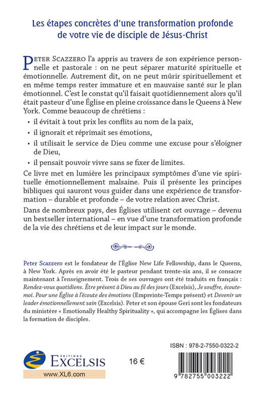 Peter Scazzero l’a appris au travers de son expérience personnelle et pastorale : on ne peut séparer maturité spirituelle et émotionnelle. Autrement dit, on ne peut mûrir spirituellement et en même temps rester immature et en mauvaise santé sur le plan émotionnel. C’est le constat qu’il faisait quotidiennement alors qu’il était en charge d’une Église en pleine croissance . Comme beaucoup de chrétiens : il évitait à tout prix les conflits au nom de la paix, il ignorait et réprimait ses émotions, il utilisait le service de Dieu comme une excuse pour s’éloigner de Dieu, il pensait pouvoir vivre sans se fixer de limites. Ce livre met en lumière les principaux symptômes d’une vie spirituelle émotionnellement malsaine. Puis il présente les principes bibliques qui sauront vous guider dans une expérience de transformation – durable et profonde – de votre relation avec Christ.