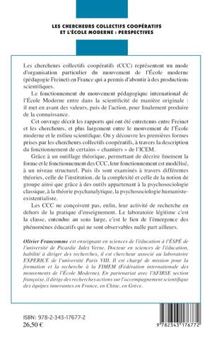 Les chercheurs collectifs coopératifs (CCC) représentent un mode d'organisation particulier du mouvement pédagogique international de l'Ecole Moderne entre dans la scientificité de manière originale : il met ne avant des valeurs, puis de l'action, pour finalement produire de la connaissance. Cet ouvrage décrit les rapports qui ont été entretenus entre Freinet et les chercheurs, et plus largement être le mouvement de l'Ecole moderne et le milieu scientifique. On y découvre les premières formes prises par les chercheurs collectifs coopératifs, à travers la description du fonctionnement de certains "chantiers" de l'ICEM.