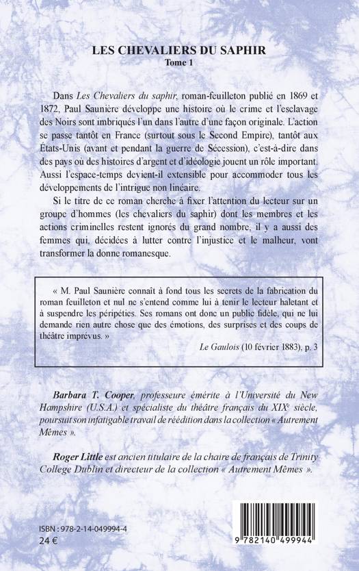 Dans Les Chevaliers du saphir, roman-feuilleton publié en 1869 et 1872, Paul Saunière développe une histoire où le crime et l'esclavage des Noirs sont imbriqués l'un dans l'autre d'une façon originale. L'action se passe tantôt en France, tantôt aux États-Unis, c'est-à-dire dans des pays où des histoires d'argent et d'idéologie jouent un rôle important. Aussi l'espace-temps devient-il extensible pour accommoder tous les développements de l'intrigue non linéaire. Si le titre de ce roman cherche à fixer l'attention du lecteur sur un groupe d'hommes (les chevaliers du saphir) dont les membres et les actions criminelles restent ignorés du grand nombre, il y a aussi des femmes qui, décidées à lutter contre l'injustice et le malheur, vont transformer la donne romanesque.