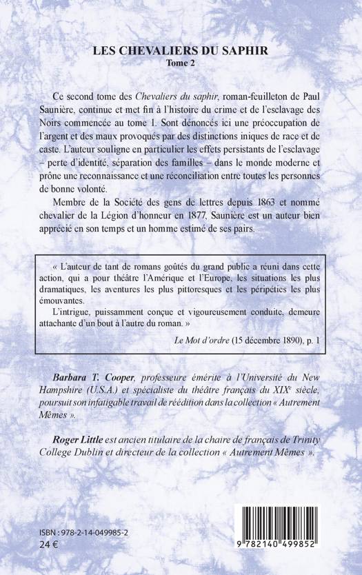 Ce second tome des Chevaliers du saphir, roman-feuilleton de Paul Saunière, continue et met fin à l'histoire du crime et de l'esclavage des Noirs commencée au tome 1. Sont dénoncés ici une préoccupation de l'argent et des maux provoqués par des distinctions iniques de race et de caste. L'auteur souligne en particulier les effets persistants de l'esclavage perte d'identité, séparation des familles dans le monde moderne et prône une reconnaissance et une réconciliation entre toutes les personnes de bonne volonté. Membre de la Société des gens de lettres depuis 1863 et nommé chevalier de la Légion d'honneur en 1877, Saunière est un auteur bien apprécié en son temps et un homme estimé de ses pairs.