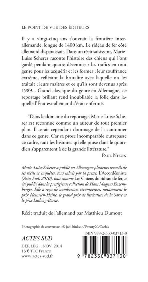 Il y a vingt-cinq ans s'ouvrait la frontière interallemande, longue de 1400 km. Le rideau de fer côté allemand disparaissait. Dans un récit saisissant, Marie- Luise Scherer raconte l'histoire des chiens qui l'ont gardé pendant quatre décennies : les trafics en tout genre pour les acquérir et les former ; leur souffrance extrême, reflétant la brutalité avec laquelle on les traitait ; leurs maîtres et ce qu'ils sont devenus après 1989... Grand classique du genre en Allemagne, ce reportage brillant rend inoubliable la folie dans laquelle l'État est-allemand s'était enfermé.