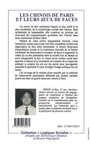 Partant de la notion de face, aspect le plus subtil de la psychologie sociale des Chinois, une étude sur l'interaction sociale, considérée comme une négociation de face entre partenaires. Cet ouvrage est le résultat d'une enquête par la méthode de l'observation participante effectuée par l'auteur pendant quatre ans dans un grand restaurant chinois de Paris.