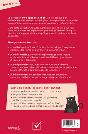 Des textes adaptés pour lire plus facilement ! Pour faciliter l’apprentissage de la lecture, les mots qui composent les histoires ont été sélectionnés en fonction de leur familiarité, de leur structure syllabique et des graphèmes* qu’ils contiennent. Plusieurs adaptations visuelles permettent de réduire la charge cognitive liée au décodage et de limiter l’encombrement perceptif. Les livrets contiennent deux fois la même histoire : dans la première version, syllabes orales, lettres muettes et graphèmes complexes sont mis en relief ; dans la seconde, ces adaptations ne sont pas présentes. Ce sont donc des outils polyvalents qui favorisent le transfert des acquis et qui conviennent à tous les enfants. Les histoires fantaisistes mettent en scène des personnages rigolos et attachants. La trame narrative captive les jeunes lecteurs tout en leur permettant de faire des prédictions. Les illustrations leur donnent aussi de nombreuses occasions de faire des inférences.