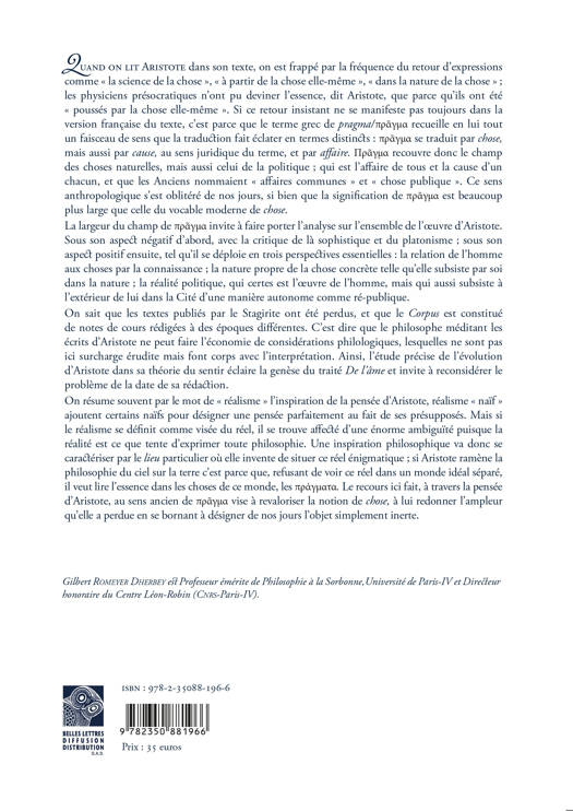 Quand on lit Aristote dans son texte, on est frappe par la frequence du retour d'expressions comme la science de la chose , a partir de la chose elle-meme , dans la nature de la chose ; les physiciens presocratiques n'ont pu deviner l'essence, dit Aristote, que parce qu'ils ont ete pousses par la chose elle-meme . Si ce retour insistant ne se manifeste pas toujours dans la version francaise du texte, c'est parce que le terme grec de pragma recueille en lui tout un faisceau de sens que la traduction fait eclater en termes distincts: pragma se traduit par chose, mais aussi par cause, au sens juridique du terme, et par affaire. pragma recouvre donc le champ des choses naturelles, mais aussi celui de la politique; qui est l'affaire de tous et la cause d'un chacun, et que les Anciens nommaient affaires communes et chose publique . Ce sens anthropologique s'est oblitere de nos jours, si bien que la signification de pragma est beaucoup plus large que celle du vocable moderne de chose. La largeur du champ de pragma invite a faire porter l'analyse sur l'ensemble de l'oeuvre d'Aristote. Sous son aspect negatif d'abord, avec la critique de la sophistique et du platonisme; sous son aspect positif ensuite, tel qu'il se deploie en trois perspectives essentielles: la relation de l'homme aux choses par la connaissance; la nature propre de la chose concrete telle qu'elle subsiste par soi dans la nature; la realite politique, qui certes est l'oeuvre de l'homme, mais qui aussi subsiste a l'exterieur de lui dans la Cite d'une maniere autonome comme re-publique. On sait que les textes publies par le Stagirite ont ete perdus, et que le Corpus est constitue de notes de cours redigees a des epoques differentes. C'est dire que le philosophe meditant les ecrits d'Aristote ne peut faire l'economie de considerations philologiques, lesquelles ne sont pas ici surcharge erudite mais font corps avec l'interpretation. Ainsi, l'etude precise de l'evolution d'Aristote dans sa theorie du sentir eclaire la genese du traite De l'ame et invite a reconsiderer le probleme de la date de sa redaction. On resume souvent par le mot de realisme l'inspiration de la pensee d'Aristote, realisme naif ajoutent certains naifs pour designer une pensee parfaitement au fait de ses presupposes. Mais si le realisme se definit comme visee du reel, il se trouve affecte d'une enorme ambiguite puisque la realite est ce que tente d'exprimer toute philosophie. Une inspiration philosophique va donc se caracteriser par le lieu particulier ou elle invente de situer ce reel enigmatique; si Aristote ramene la philosophie du ciel sur la terre c'est parce que, refusant de voir ce reel dans un monde ideal separe, il veut lire l'essence dans les choses de ce monde, les p ata. Le recours ici fait, a travers la pensee d'Aristote, au sens ancien de ... vise a revaloriser la notion de chose, a lui redonner l'ampleur qu'elle a perdue en se bornant a designer de nos jours l'objet simplement inerte.