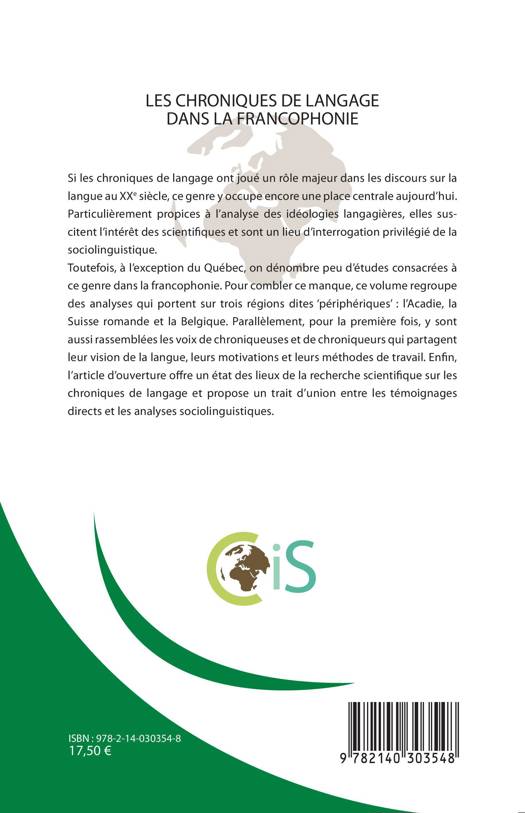 Si les chroniques de langage ont joué un rôle majeur dans les discours sur la langue au XXe siècle, ce genre y occupe encore une place centrale aujourd'hui. Particulièrement propices à l'analyse des idéologies langagières, elles suscitent l'intérêt des scientifiques et sont un lieu d'interrogation privilégié de la sociolinguistique. Toutefois, à l'exception du Québec, on dénombre peu d'études consacrées à ce genre dans la francophonie. Pour combler ce manque, ce volume regroupe des analyses qui portent sur trois régions dites 'périphériques': l'Acadie, la Suisse romande et la Belgique. Parallèlement, pour la première fois, y sont aussi rassemblées les voix de chroniqueuses et de chroniqueurs qui partagent leur vision de la langue, leurs motivations et leurs méthodes de travail. Enfin, l'article d'ouverture offre un état des lieux de la recherche scientifique sur les chroniques de langage et propose un trait d'union entre les témoignages directs et les analyses sociolinguistiques