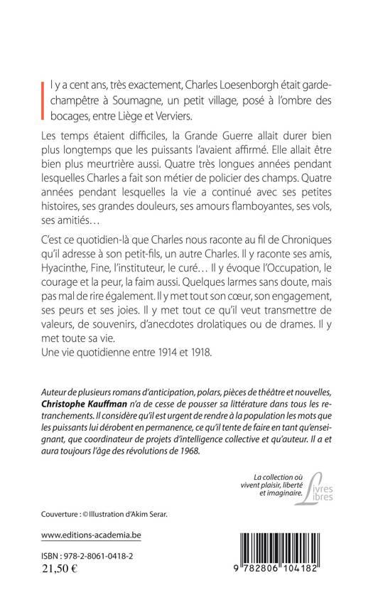 Il y a cent ans, Charles Loesenborgh était garde-champêtre à Soumagne, petit village, posé à l’ombre des bocages. Les temps étaient difficiles, la Grande Guerre durait plus longtemps qu’on ne le pensait. C’est ce quotidien que Charles nous raconte au fil de Chroniques qu’il adresse à son petit-fils. Il y raconte ses amis, Hyacinthe, Fine, l’instituteur, le curé... évoque l’Occupation, le courage, la peur, la faim aussi. Quelques larmes sans doute, mais pas mal de rires également. Il y met son coeur, sa vie. Une vie quotidienne entre 1914 et 1918.