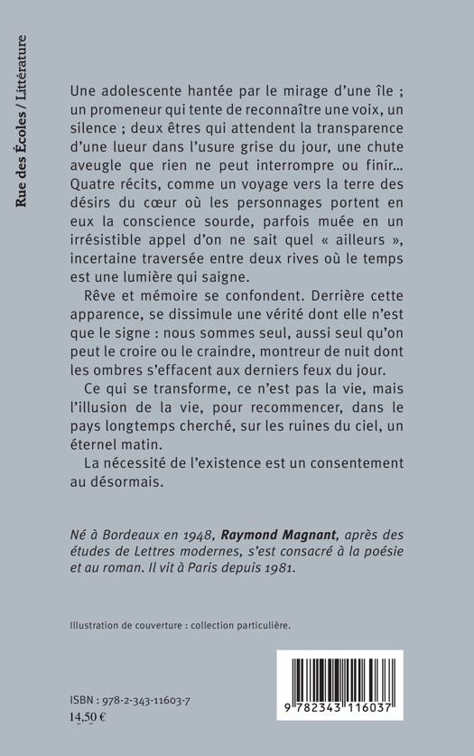 Une adolescente hantée par le mirage d'une île ; un promeneur qui tente de reconnaître une voix, un silence ; deux êtres qui attendent la transparence d'une lueur dans l'usure grise du jour, une chute aveugle que rien ne peut interrompre ou finir... Quatre récits, comme un voyage vers la terre des désirs du coeur où les personnages portent en eux la conscience sourde, parfois muée en un irrésistible appel d'on ne sait quel « ailleurs », incertaine traversée entre deux rives où le temps est une lumière qui saigne. Rêve et mémoire se confondent.