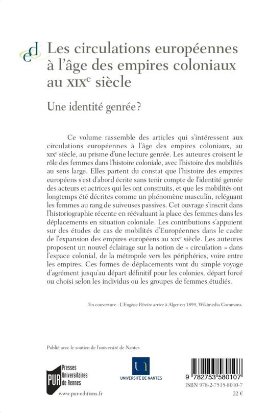 Ce volume rassemble des articles qui s’intéressent aux circulations européennes à l’âge des empires coloniaux, au XIXe siècle, au prisme d’une lecture genrée. Les auteures croisent le rôle des femmes dans l’histoire coloniale, avec l’histoire des mobilités au sens large. Elles partent du constat que l’histoire des empires européens s’est d’abord écrite sans tenir compte de l’identité genrée des acteurs et actrices qui les ont construits, et que les mobilités ont longtemps été décrites comme un phénomène masculin, reléguant les femmes au rang de suiveuses passives. Cet ouvrage s’inscrit dans l’historiographie récente en réévaluant la place des femmes dans les déplacements en situation coloniale. Les contributions s’appuient sur des études de cas de mobilités d’Européennes dans le cadre de l’expansion des empires européens au XIXe siècle. Les auteures proposent un nouvel éclairage sur la notion de « circulation » dans l’espace colonial, de la métropole vers les périphéries, voire entre les empires. Ces formes de déplacements vont du simple voyage d’agrément jusqu’au départ définitif pour les colonies, départ forcé ou choisi selon les individus ou les groupes de femmes étudiés.
