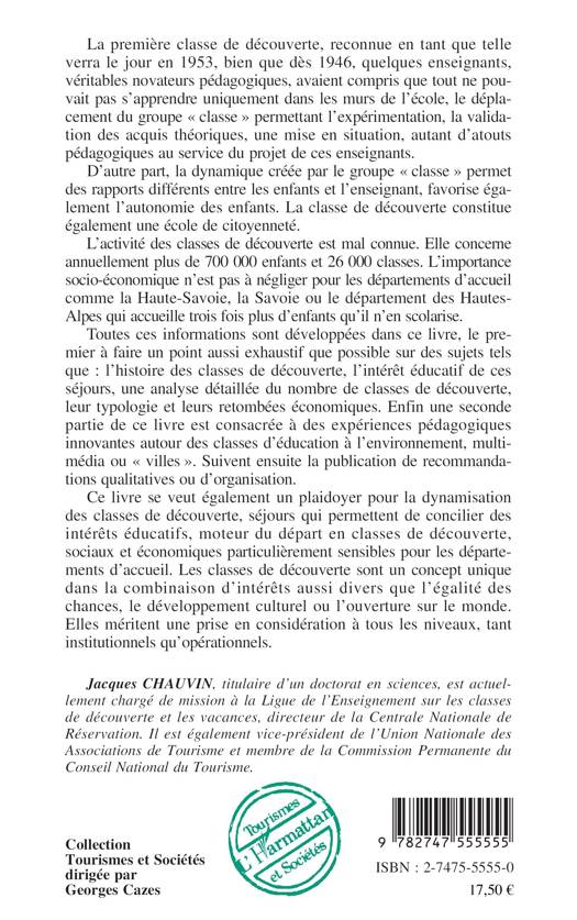 L'activité des classes de découverte est mal connue. Elle concerne annuellement plus de 700 000 enfants et 26 000 classes. Ce livre fait le point sur des sujets tels que : l'histoire des classes de découverte, l'intérêt éducatif de ces séjours, une analyse détaillée du nombre de classes de découverte, leur typologie et leurs retombées économiques. Une seconde partie est consacrées à des expériences pédagogiques innovantes. Suivent ensuite la publication de recommandations qualitatives ou d'organisation. Ce livre se veut un plaidoyer pour la dynamisation des classes de découverte.