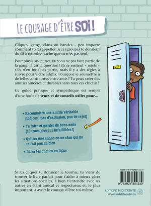 Cliques, gangs, clans ou bandes… peu importe comment tu les appelles, si ces groupes te donnent du fil à retordre, sache que tu n’es pas seul. Pour plusieurs jeunes, faire ou ne pas faire partie de la gang, là est la question ! Ils se sentent « rejets » s’ils n’en font pas partie, mais il y a des règles à suivre pour y être admis. Pourquoi se soumettre à de telles contraintes entre amis ? Tu peux créer des amitiés sincères et durables sans tous ces chichis ! Ce guide pratique et sympathique est rempli d’une foule de trucs et de conseils utiles pour… Comprendre pourquoi ce n’est pas cool de mentir ou de faire semblant entre amis ; reconnaître une amitié véritable (indices : pas d’exclusion, pas de rejet) ; te faire et garder de bons amis (10 trucs presque infaillibles !) ; quitter une clique ou un clan qui ne te fait pas de bien ; gérer les cliques en ligne. Si les cliques te donnent le tournis, tu viens de trouver le livre parfait pour t’aider à mieux gérer les situations sociales, à bien t’entendre avec les autres en étant amical et respectueux et, le plus important, à avoir le courage d’être toi-même.