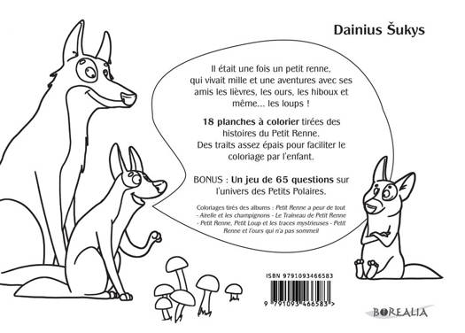 Il était une fois un petit renne, qui vivait mille et une aventures avec ses amis les lièvres, les ours, les hiboux et même... les loups ! 18 planches à colorier tirées des histoires du Petit Renne. Des traits assez épais pour faciliter le coloriage par l’enfant. ----COUVERTURE BLANC PAILLETÉE !! ---- L'illustrateur : Dainius Sukys a 40 ans et il est lituanien. Il dessine depuis qu’il est petit et travaille comme graphiste dans un journal à Vilnius. Il est l’auteur d’une série de livres humoristiques pour adultes et enfants édités en Lituanie.Le livre de coloriage de la collection les Petits Polaires avec les aventures de Petit Renne dans les 5 premiers albums. 38 pages de dessins au trait assez épais pour les petits et un bonus de 65 questions sur les albums. Un bel album couverture rigide à la couverture pailletée. L'idéal pour un cadeau ou pour un album de coloriage qui va rester à l'enfant.