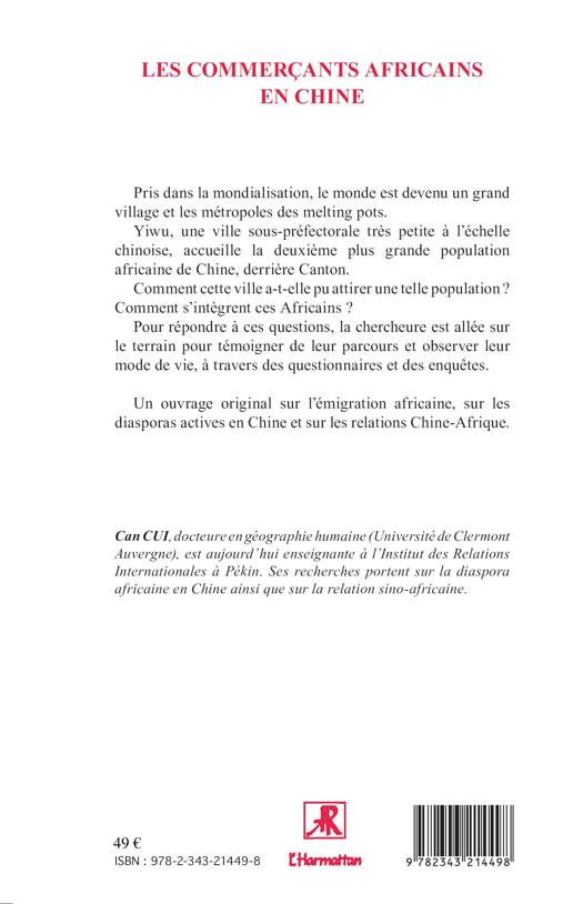 Pris dans la mondialisation, le monde est devenu un grand village et les métropoles des melting pots. Yiwu, une ville sous-préfectorale très petite à l'échelle chinoise, accueille la deuxième plus grande population africaine de Chine, derrière Canton. Comment cette ville a-t-elle pu attirer une telle population ? Comment s'intègrent ces Africains ? Pour répondre à ces questions, la chercheure est allée sur le terrain pour témoigner de leur parcours et observer leur mode de vie, à travers des questionnaires et des enquêtes. Un ouvrage original sur l'émigration africaine, sur les diasporas actives en Chine et sur les relations Chine-Afrique.
