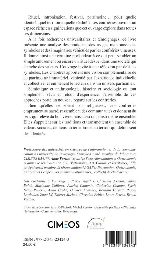 Rituel, intronisation, festival, patrimoine... pour quelle identité, quel territoire, quelle réalité ? Les confréries ouvrent un espace riche en significations que cet ouvrage explore dans toutes ses dimensions. À la fois recherches universitaires et témoignages, ce livre présente une analyse des pratiques, des usages mais aussi des symboles et des imaginaires véhiculés par les confréries vineuses. Il donne ainsi une certaine profondeur à ce qui peut sembler un simple amusement ou encore un rituel désuet dans une société qui cherche des valeurs. Les chapitres apportent une vision complémentaire de ce patrimoine immatériel, véhiculé par l’expérience individuelle et collective, et emmènent le lecteur dans un univers particulier.