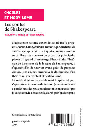 Shakespeare raconté aux enfants : tel fut, au début du XIXe siècle, le projet de Charles Lamb et de sa soeur Mary avec ces versions en prose des principales pièces du grand dramaturge. Plutôt que de dispenser de la lecture de Shakespeare, il s'agit d'en donner un avant-goût, de préparer des oreilles encore tendres à un théâtre souvent violent et déstabilisant. Le résultat est remarquablement limpide, et s'apparente aux contes de Perrault.