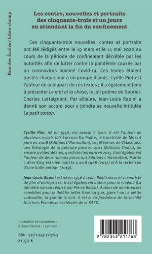 Ces cinquante-trois nouvelles, contes et portraits ont été rédigés entre le 19 mars et le 11 mai 2020 au cours de la période de confinement décrétée par les autorités afin de lutter contre la pandémie causée par un coronavirus nommé Covid-19. Ces textes étaient postés chaque jour à un groupe d'amis. Cyrille Piot est l'auteur de la plupart de ces textes ; il a également tenu à présenter Le mot et la chose, le joli poème de Gabriel- Charles Lattaignant. Par ailleurs, Jean-Louis Rapini a donné son accord pour y joindre sa nouvelle intitulée Le petit carton.