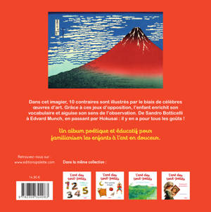 Jour et nuit, petit et grand, dessus et dessous… L’apprentissage du vocabulaire par le biais des contraires est fréquente dans la petite enfance. Avec poésie, cet imagier met en lumière ces jeux d’opposition en proposant, face à face, deux œuvres qui se répondent.