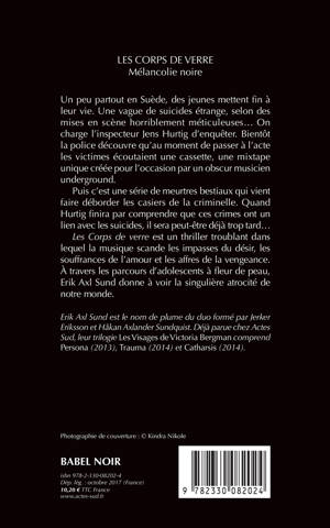 Un peu partout en Suède, des jeunes mettent fin à leur vie. Une vague de suicides étrange, selon des mises en scène horriblement méticuleuses... On charge l'inspecteur Jens Hurtig d'enquêter. Bientôt la police découvre qu'au moment de passer à l'acte les victimes écoutaient une cassette, une mixtape unique créée pour l'occasion par un obscur musicien underground. Puis c'est une série de meurtres bestiaux qui vient faire déborder les casiers de la criminelle. Quand Hurtig finira par comprendre que ces crimes ont un lien avec les suicides, il sera peut-être déjà trop tard... Les Corps de verre est un thriller troublant dans lequel la musique scande les impasses du désir, les souffrances de l'amour et les affres de la vengeance. À travers les parcours d'adolescents à fleur de peau, Erik Axl Sund donne à voir la singulière atrocité de notre monde.