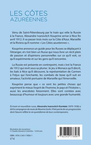 Venu de Saint-Pétersbourg par le train qui relie la Russie à la France, Alexandre Ivanovitch Kouprine arrive à Nice fin avril 1912. Il va passer trois mois sur la Côte d'Azur, Marseille et la Riviera qu'il nomme « Les Côtes azuréennes ». Kouprine annonce un guide pour les Russes se déplaçant à l'étranger, qui nous livre un récit plein de passion et d'opinions personnelles sur ce qu'il voit, ce qu'il expérimente et sur les gens qu'il rencontre.