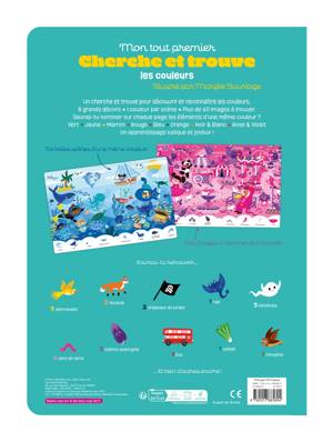 Un cherche et trouve pour découvrir et reconnaître les couleurs. 8 grands décors. 1 couleur par scène. Plus de 60 images à trouver. Sauras-tu nommer sur chaque page les éléments d'une même couleur ? Vert. Jaune. Marron. Rouge. Bleu. Orange. Noir et Blanc. Rose et Violet. Un apprentissage ludique et joyeux ! Parmi de belles scènes d'une même couleur et des images à nommer et à trouver, sauras-tu retrouver 3 perroquets, 2 renards, 2 drapeaux de pirate, 1 raie, 3 fantômes, 4 vers de terre, 3 ballons aubergines, 1 bus, 1 salade, 1 chouette... et bien d'autres encore !
