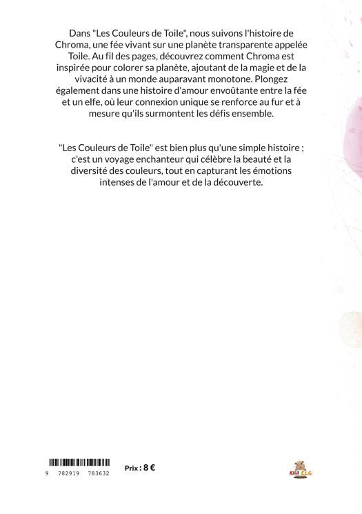 Dans "Les Couleurs de Toile", nous suivons l'histoire de Chroma, une fée vivant sur une planète transparente appelée Toile. Au fil des pages, découvrez comment Chroma est inspirée pour colorer sa planète, ajoutant de la magie et de la vivacité à un monde auparavant monotone. Plongez également dans une histoire d'amour envoûtante entre la fée et un elfe, où leur connexion unique se renforce au fur et à mesure qu'ils surmontent les défis ensemble.