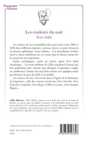 Les couleurs du noir rassemblent des textes écrits entre 1984 et 2018 dans différents registres poèmes, lettres, extraits d'oeuvres en devenir, aphorismes, textes intimes... Ces miscellanées révèlent ainsi le talent multiforme de cet artiste dont le drame intime fut le creuset de son inspiration. Quête ontologique, quête de l'autre, quête d'un idéal chimérique... Les mots brûlants de Gilles touchent le lecteur par leur profondeur, leur véracité, leur désespoir. Cependant, malgré ses souffrances, l'auteur sait aussi faire sourire avec quelques textes qui donnent un peu de soleil à l'ensemble. Les couleurs du noir s'inscrivent dans la lignée de la littérature de fragments, celle des oeuvres inachevées d'un Novalis, d'un Giacomo Leopardi, d'un Roger Gilbert-Leconte, d'un Jacques Rigaut...