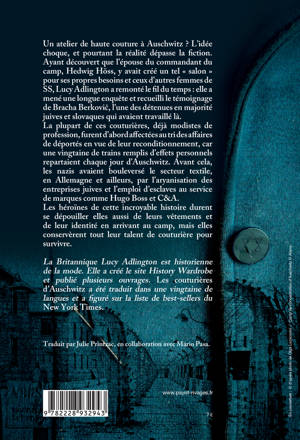 Comment des jeunes femmes en majorité juives et slovaques survécurent à Auschwitz en y travaillant dans l'atelier de haute couture créé à l'été 1943 par Edwig Höss, l'épouse du commandant du camp, pour ses propres besoins et ceux d'autres femmes de SS (y compris dans l'élite berlinoise). Un témoignage d'autant plus saisissant qu'il mêle l'enfer concentrationnaire à l'existence dorée des geôliers, sous la plume d'une historienne de la mode. Et une enquête sur la façon dont l'aryanisation économique déstabilisa le secteur textile, pas seulement en Allemagne, et dont la récupération des affaires de déportés devint une véritable industrie de reconditionnement, au point qu'une vingtaine de trains remplis d'effets personnels repartaient quotidiennement d'Auschwitz.