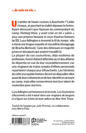 Un atelier de haute couture à Auschwitz ? L'idée choque, et pourtant la réalité dépasse la fiction. Ayant découvert que l'épouse du commandant du camp, Hedwig Höss, y avait créé un tel "salon" pour ses propres besoins et ceux d'autres femmes de SS, Lucy Adlington a remonté le fil du temps : elle a mené une longue enquête et recueilli le témoignage de Bracha Berkovič, l'une des détenues en majorité juives et slovaques qui avaient travaillé là. La plupart de ces couturières, déjà modistes de profession, furent d'abord affectées au tri des affaires de déportés en vue de leur reconditionnement, car une vingtaine de trains remplis d'effets personnels repartaient chaque jour d'Auschwitz. Les héroïnes de cette incroyable histoire durent se dépouiller elles aussi de leurs vêtements et de leur identité en arrivant au camp, mais elles conservèrent tout leur talent de couturière pour survivre.