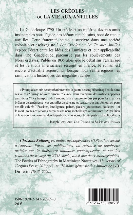 La Guadeloupe 1790. Un créole et un mulâtre, devenus amis inséparables sous l'égide des idéaux républicains, sont de retour aux îles. Cette fraternité peut-elle survivre dans une société coloniale et esclavagiste ? Les Créoles ou La Vie aux Antilles explore l'écart entre les idées des Lumières et leur applicabilité dans une Guadeloupe parcourue par les soulèvements des Noirs esclaves. Publié en 1835 alors que le débat sur l'esclavage et les relations interraciales resurgit en France, le roman est encore d'actualité aujourd'hui lorsque nous réinterrogeons les ramifications historiques des inégalités raciales.