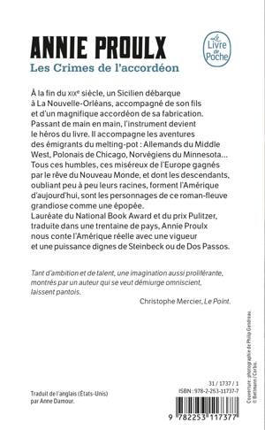 A la fin du xixe siècle, un Sicilien débarque à La Nouvelle-Orléans, accompagné de son fils et d'un magnifique accordéon de sa fabrication. Passant de main en main, l'instrument devient le héros du livre. Il accompagne les aventures et tribulations des émigrants du melting-pot : Allemands du Middle West, Polonais de Chicago, Norvégiens du Minnesota… Tous ces humbles, ces miséreux de l'Europe gagnés par le rêve du Nouveau Monde, et dont les descendants, oubliant peu à peu leurs racines, forment l'Amérique d'aujourd'hui, sont les personnages d'un roman-fleuve grandiose comme une épopée. Lauréate du National Book Award et du prix Pulitzer, traduite dans une trentaine de pays, Annie Proulx nous conte l'Amérique réelle avec une vigueur et une puissance dignes de Steinbeck ou de Dos Passos.