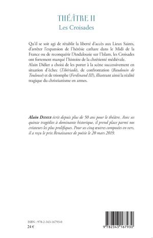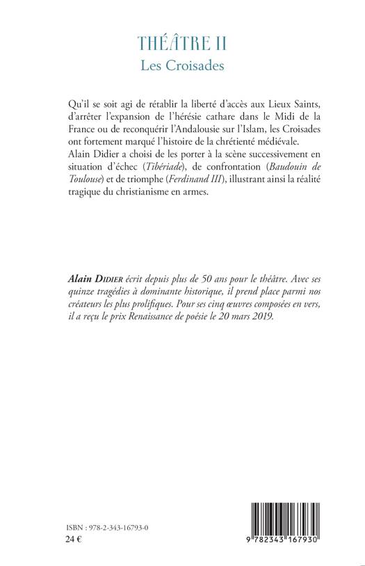 Qu'il se soit agi de rétablir la liberté d'accès aux Lieux Saints, d'arrêter l'expansion de l'hérésie cathare dans le Midi de la France ou de reconquérir l'Andalousie sur l'Islam, les Croisades ont fortement marqué l'histoire de la chrétienté médiévale. Alain Didier a choisi de les porter à la scène successivement en situation d'échec (Tibériade), de confrontation (Baudouin de Toulouse) et de triomphe (Ferdinand III), illustrant ainsi la réalité tragique du christianisme en armes.