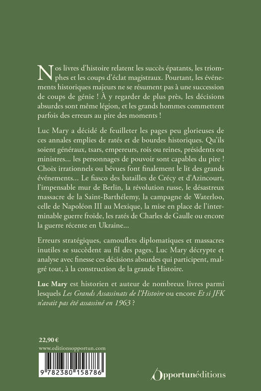 Luc Mary a décidé de feuilleter les pages peu glorieuses de ces annales emplies de ratés et de bourdes historiques. Qu'ils soient généraux, tsars, empereurs, rois ou reines, présidents ou ministres... les personnages de pouvoir sont capables du pire ! Choix irrationnels ou bévues font finalement le lit des grands événements... Le fiasco des batailles de Crécy et d'Azincourt, l'impensable mur de Berlin, la révolution russe, le désastreux massacre de la Saint-Barthélémy, la campagne de Waterloo, celle de Napoléon III au Mexique, la mise en place de l'interminable guerre froide, les ratés de Charles de Gaulle ou encore la guerre récente en Ukraine...