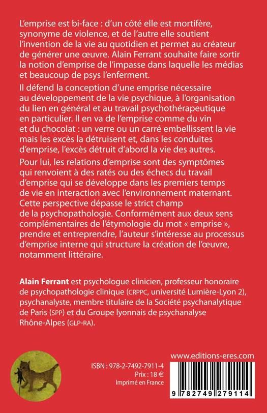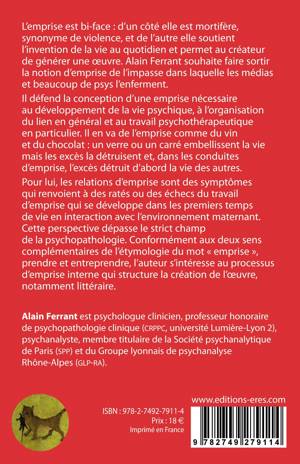 Alain Ferrant défend la conception d’une emprise nécessaire au développement de la vie psychique, à l’organisation du lien en général et au travail psychothérapeutique en particulier. Il en va de l’emprise comme du vin et du chocolat : un verre ou un carré embellissent la vie mais les excès la détruisent et, dans les conduites d’emprise, l’excès détruit d’abord la vie des autres. La thématique générale de ce livre est de considérer que les relations d’emprise sont des symptômes qui renvoient à des ratés ou des échecs du travail d’emprise qui se développe dans les premiers temps de vie en interaction avec l’environnement maternant. Mais sa perspective dépasse le strict champ de la psychopathologie. Conformément aux deux sens complémentaires de l’étymologie du mot « emprise », prendre et entreprendre, l’auteur s’intéresse au processus d’emprise interne qui structure la création de l’œuvre, notamment littéraire.